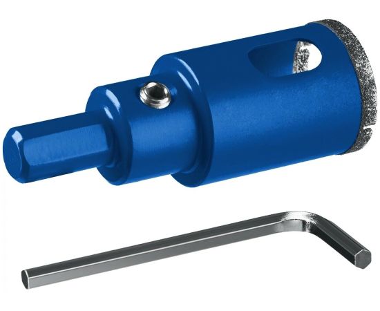 Сверло используется для сверления отверстий в кафеле, керамике и стекле с помощью электродрели. Благодаря алмазному покрытию отверстие получается без трещин и сколов. Обязательно охлаждение водой. Оснащено центрирующим сверлом и имбусовым ключом. Оснастка выполнена из углеродистой стали. Наиболее подходящая скорость сверления 1000-1500 об/мин.