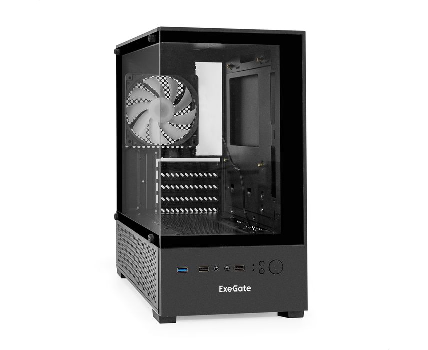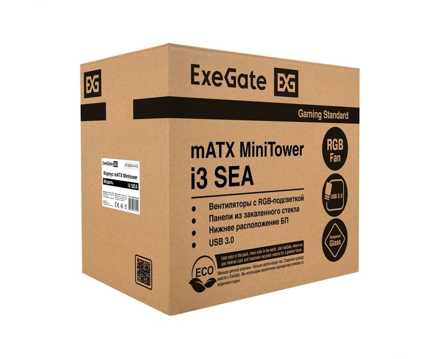 Корпус Exegate i3 Sea EX298221RUS Minitower (mATX, без БП, 1*USB+1*USB3.0, HD аудио, черный, 1 вент. 12см с RGB подсветкой, передняя и боковая