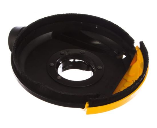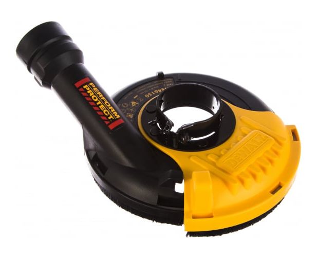 Защитный кожух DWE 46150 используется совместно с угловыми шлифовальными машинами фирмы DEWALT, имеющими диаметр диска 115 мм или 125 мм. Крепится к инструменту при помощи бесключевого зажима. Кожух представляет собой экран в форме полукруга, который защищает оператора от частиц обрабатываемого материала во время работы, а также от осколков в случае возможного разрушения диска. Оснастка оснащена сдвижной секцией, которая позволяет обработать кромки и углы. Для подключения шланга системы пылеудаления, совместимого с системой AIRLOCK DEWALT, есть коннектор.