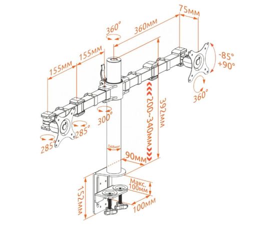 Дополнительная информация: угол наклона: -85° - +90°; угол поворота: 360°; вылет от основания: 0-385мм; вертикальное перемещение: 200-340мм; портретная/альбомная ориентация экрана
