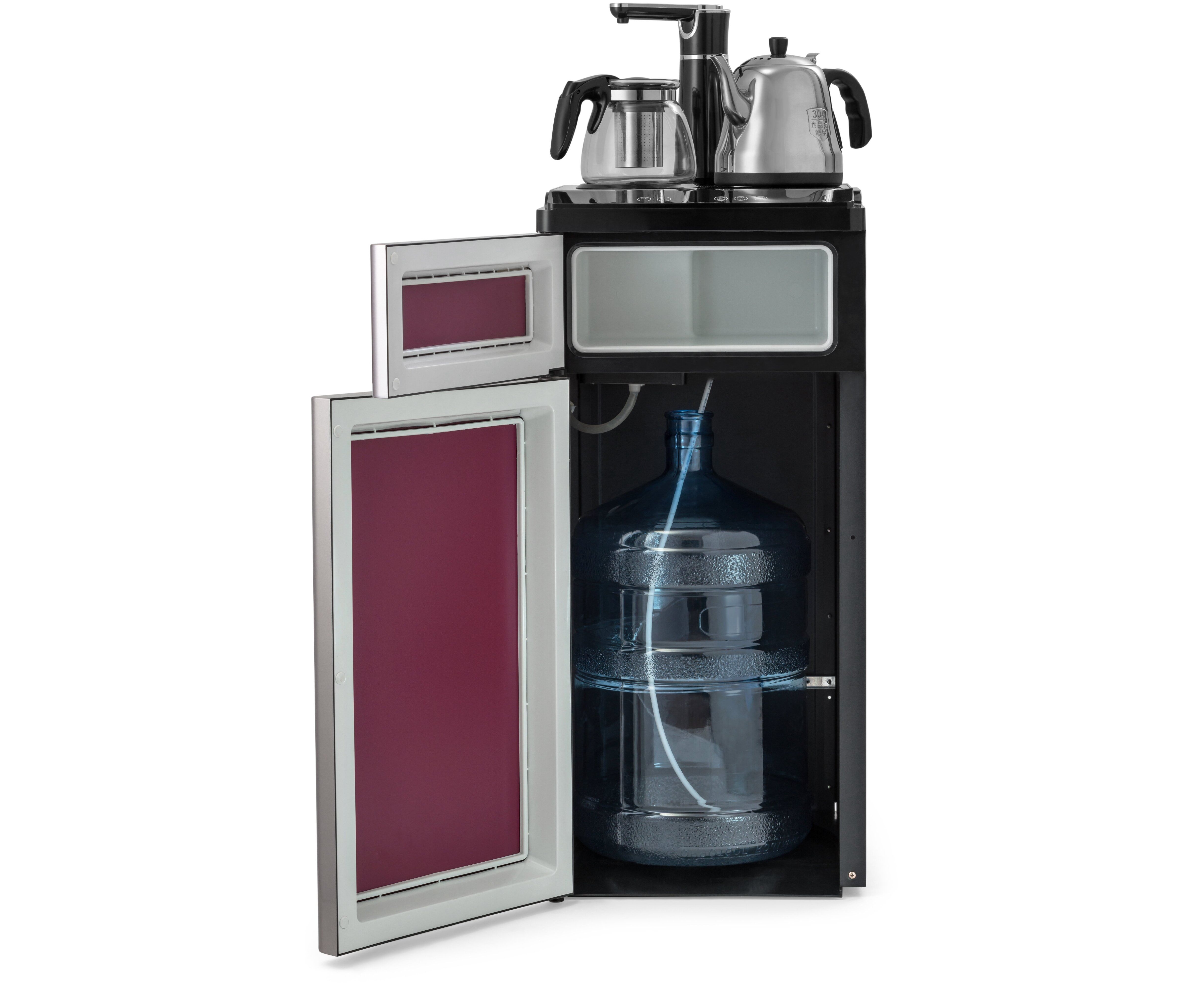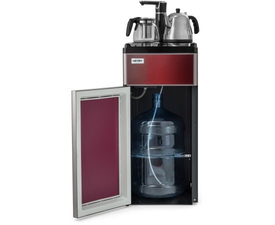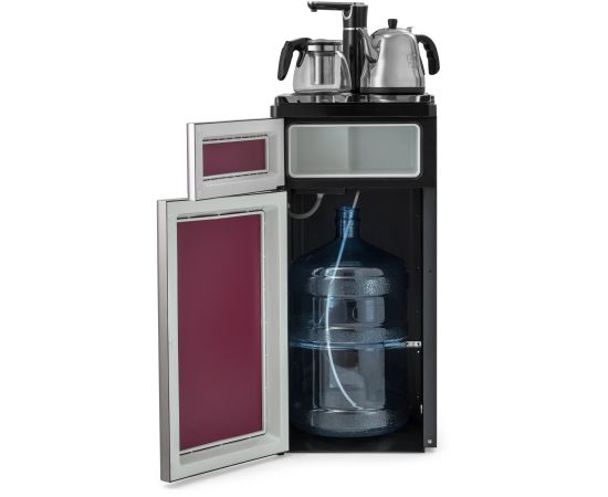 один кран для холодной и горячей воды (установлен в верхней части аппарата), сенсорная подача воды, оснащен двумя чайниками: для заварки чая и для кипячения воды
