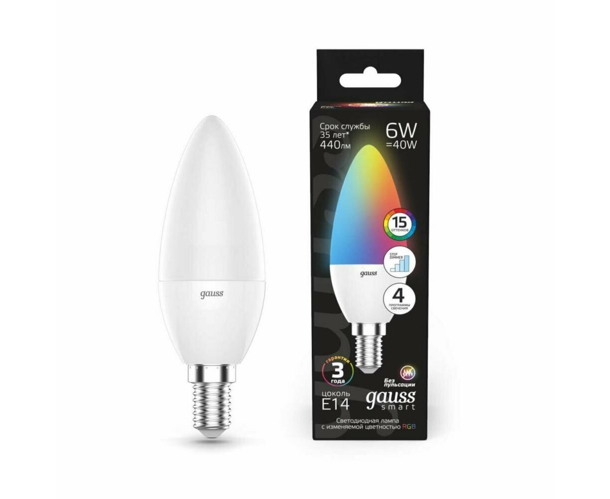 Технические характеристики Gauss Smart LED, свеча, С37, 6W, E14, RGBW+dim 103101406