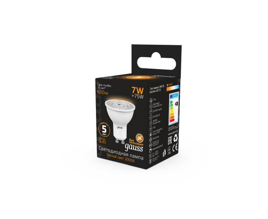 Лампа светодиодная GAUSS MR16 7W 600lm 3000K GU10 1/10/100