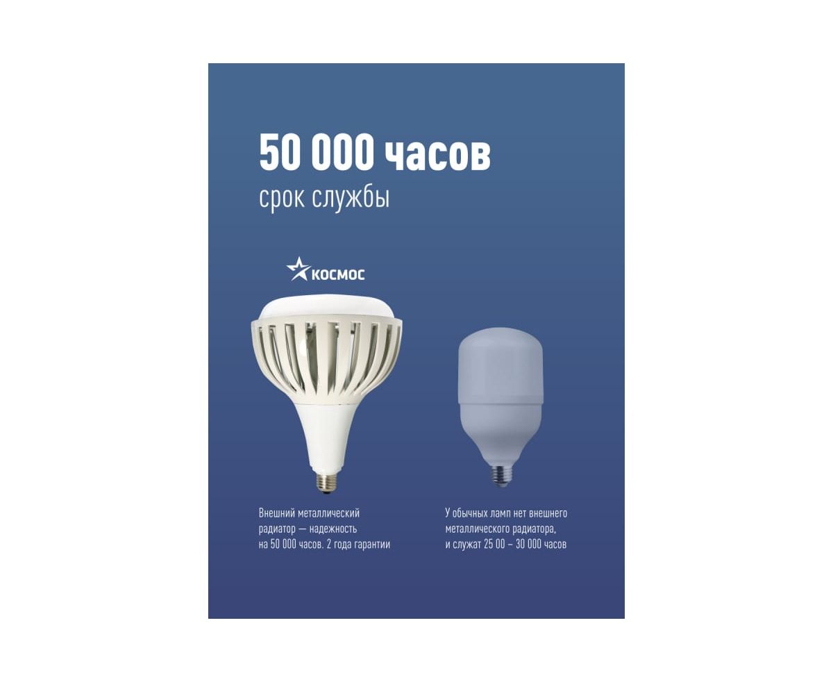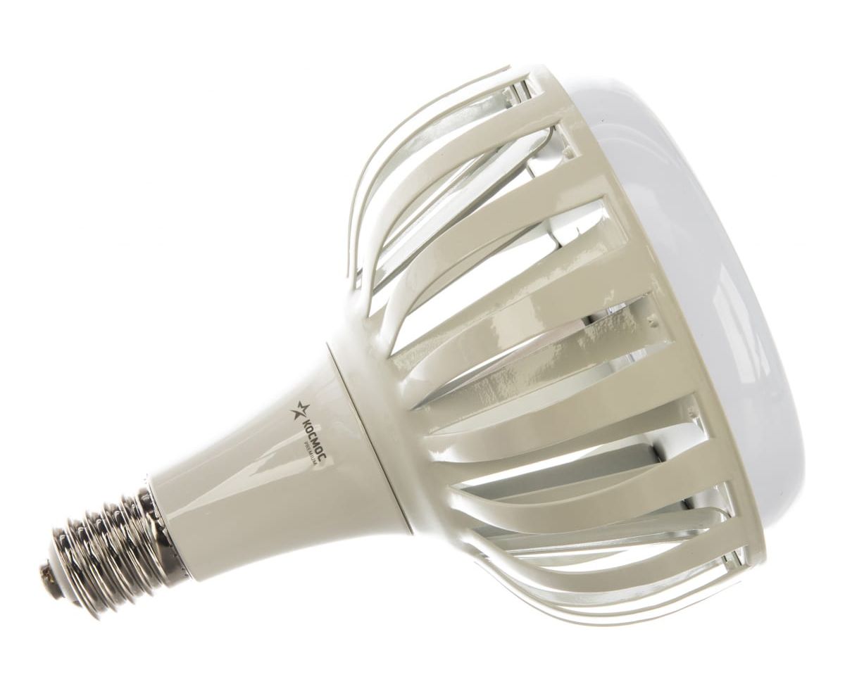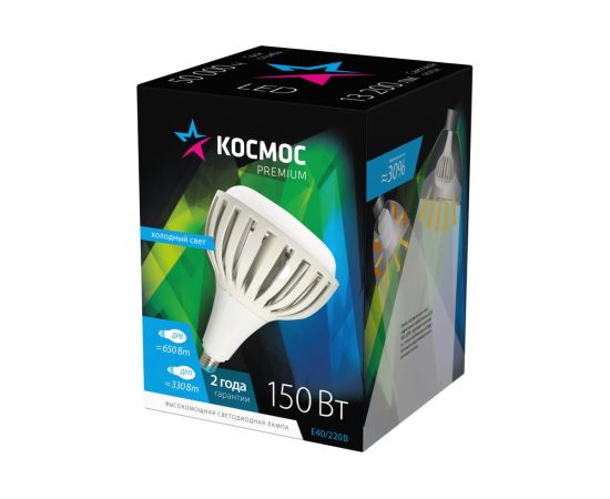 Светодиодная лампа КОСМОС PREMIUM HWLED 150W 220V E40 6500K KHWLED150WE4065 идеальна для помещений с потолками 6-11 метров: на производствах и складах, в торговых центрах и гипермаркетах. Лампа дает на 30% больше света, чем аналогичные по мощности, за счет направленного угла освещения: весь световой поток идет в полезный свет, а не поглощается светильником. Установив такую лампу, вы получаете полноценный LED-светильник, но намного дешевле, - она подходит к любым отечественным подвесным светильникам, включая НСП. Качественный свет, как у бытовых ламп. Без пульсации и с высокой передачей цветов Ra>80. Подходит для освещения оборудования с движущимися деталями, где пульсация света недопустима. Устойчива к перепадам напряжения 176-264В. Служат до 50 000 часов. Внешний металлический радиатор обеспечивает надежное охлаждение и позволяет лампе отработать полный срок без сбоев. Лампа заменяет: КЛЛ 190Вт, ДРЛ 330Вт, ДРВ 650Вт
