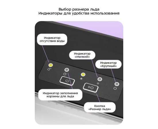 Кнопка «Размер льда» позволяет выбрать размер льда. Индикатор заполнения корзины для льда загорается, когда корзина полностью заполнилась. Когда в резервуаре для воды заканчивается вода, загорается индикатор отсутствия воды, генерация льда прекращается.
