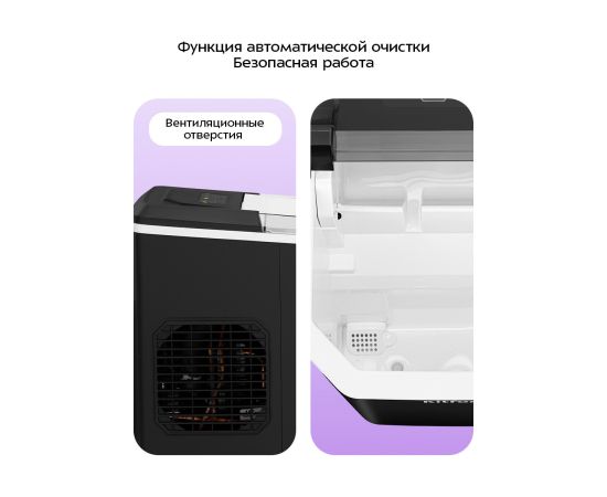 В устройстве предусмотрена функция автоматической очистки, это позволит легко ухаживать за прибором. У льдогенератора есть прозрачная крышка для наблюдения за процессом. Корзина для льда съёмная.