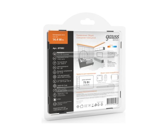Лента Gauss Basic 12V 14,4W/m 1400lm/m 3000K IP20 LED 3m BT082 способна решить ряд задач связанных как с декоративным освещением помещений, так и с экстерьерной подсветкой.