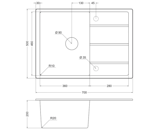 Технические характеристики EMAR EMQ-1700.Q Оникс Серия Quartz Форма прямоугольная Угловая нет Установка врезная Крыло да Расположение крыла оборачиваемая Количество чаш 1 Материал кварцевый песок Палитра черный Цвет оникс Диаметр сливного отверстия 3 1/2 дюйм Измельчитель пищевых отходов нет Клапан автомат нет Сифон в комплекте да Длина 700 мм Ширина 500 мм Внутренний размер чаши 380х460 мм Глубина чаши 200 мм Вес нетто 15.76 кг Поверхность матовая Количество готовых отверстий нет Диаметр отверстия под смеситель нет мм