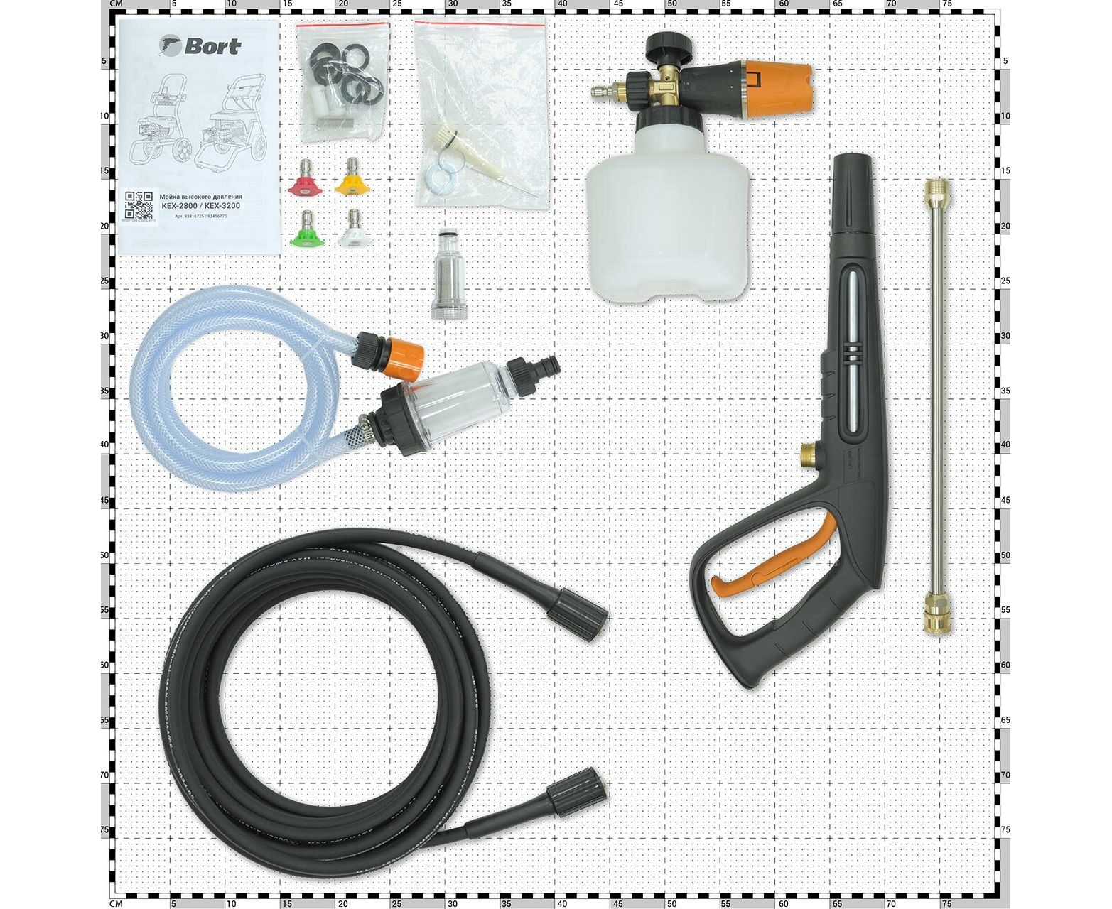 документация, игла чистящая, напорный шланг, пеногенератор, пистолет, сменные форсунки 4 шт, фильтр, шланг высокого давления