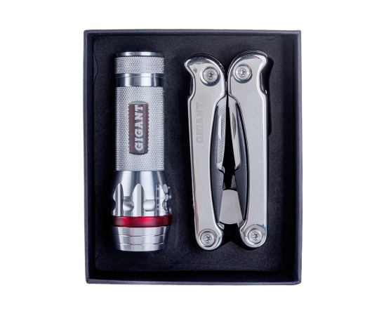 Набор мультитул Gigant 2 предмета G646 состоит из многофункционального инструмента и фонарика. Материал корпуса фонаря - сталь в сочетании с пластиком. Источником питания являются батареи типа ААА.