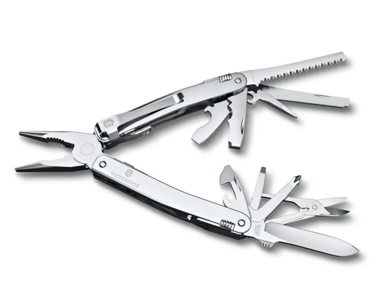 Мультитул Victorinox SwissTool Spirit MX (3.0224.MN) с возможностью раскрытия лезвия одной рукой. Острогубцы с: кусачками для тонк. и мяг. проволоки, до 40 HRC, кусачками для тв. проволоки лезвие с "плавником" для открывания одной рукой; консервный нож с: отверткой 3 мм.; открывалка для бутылок с: отверткой 6 мм., фомкой, инструментом для сгиб. проволоки, отвертка 2 мм.; шило, кернер с крючком. Ножницы; пила по дереву; ножовка по мет. с: напильником по метал. (с крупн. и мелк. насечкой); крест. отвертка 1/2; стамеска 7 мм. и скребок с: кусачками для прод. резки изоляции, кусачками для поперечн. резки изоляции, инстр. для снятия изоляции; отверстие для шнурка или клипсы; гнездо для штопора