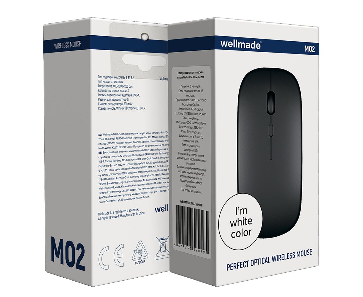 Беспроводная оптическая мышь WELLMADE M02 с разрешением до 1200 dpi и радиусом действия до 10 метров. Совместима с Windows, ChromeOS, Linux. Тип подключения: 2.4ГГц и BT 5.2. Разъем подключения адаптера: USB-А. Разъем для зарядки: Type-C. Размер устройства: 126х40х68мм. Цвет:черный.