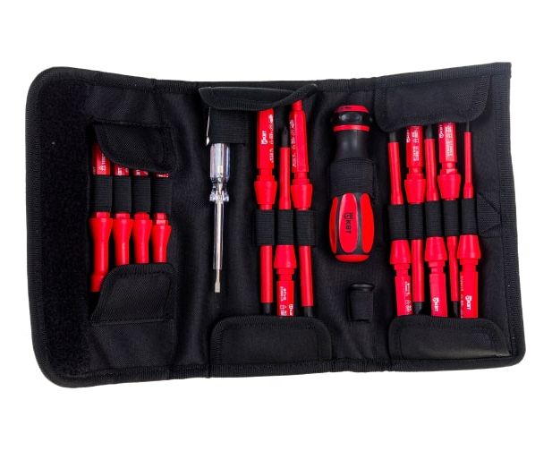 Набор диэлектрических отверток - комплект для электромонтажных работ, состоящий из эргономичной рукоятки и различных стержней с изоляцией. Комплектуется сумкой для переноски на поясе. На каждую отвертку нанесено обозначение типоразмера.