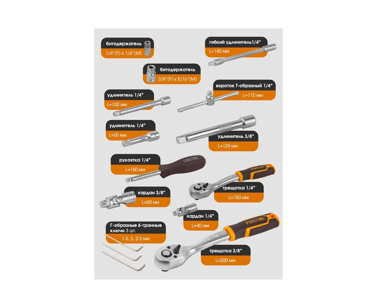Набор инструментов FORSTIME состоит из 94 предметов на 1/4" и 3/8" в кейсе и включает в себя практически всё, что необходимо для большинства ремонтных работ - как в гараже обычного автолюбителя, так и в боксе специализированного сервиса.