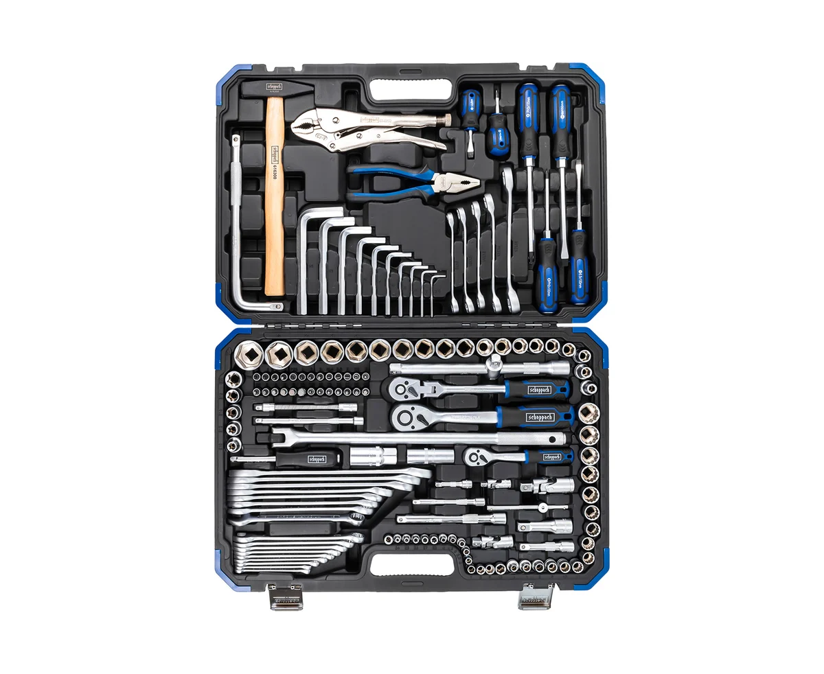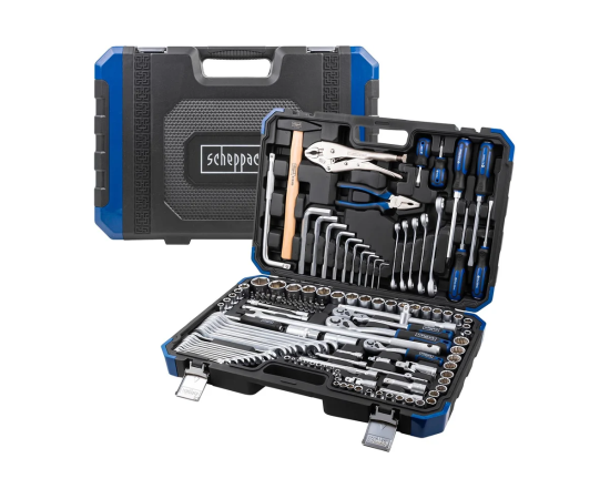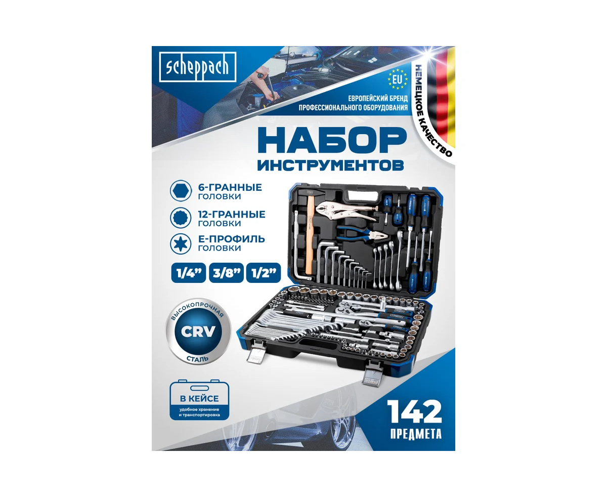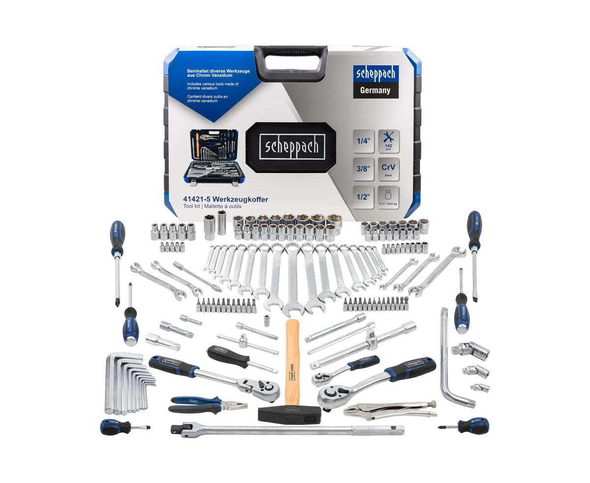 Универсальный набор инструментов для автомобиля от немецкого бренда Scheppach, состоящий из 142 предметов, оптимально подходит для использования на СТО, в мастерских, на производстве, в гараже, на даче и дома.