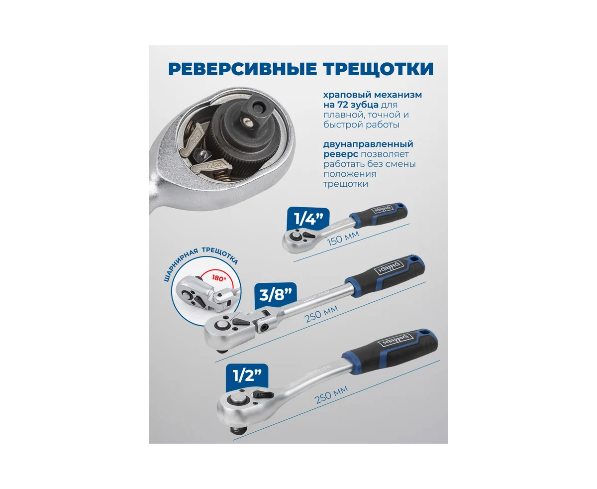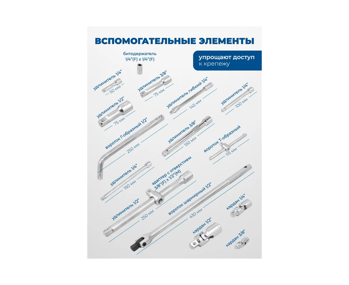 Универсальность. Благодаря наличию в наборе различных посадочных размеров (1/4 дюйма 1/2 дюйма 3/8 дюйма), инструменты подходят для выполнения как мелких, так и крупных ремонтных работ. Набор будет хорошим помощником в любой ситуации — замена свечей зажигания, работы с подвеской автомобиля или мелкие бытовые починки.
