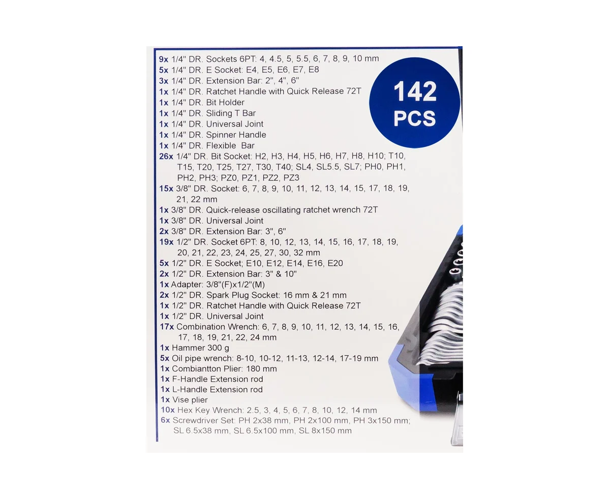 Многофункциональность. Набор из 142 предметов, включая торцевые головки различных размеров, свечные головки, головки-биты, удлинители, шарнирные карданы и шестигранные ключи. Это позволяет справиться с широким спектром задач — от обслуживания автомобиля до сборки мебели и строительства.
