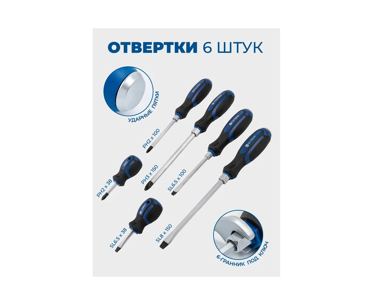 - Отвертки крестовые, шлицевые и силовые - 6 шт.;