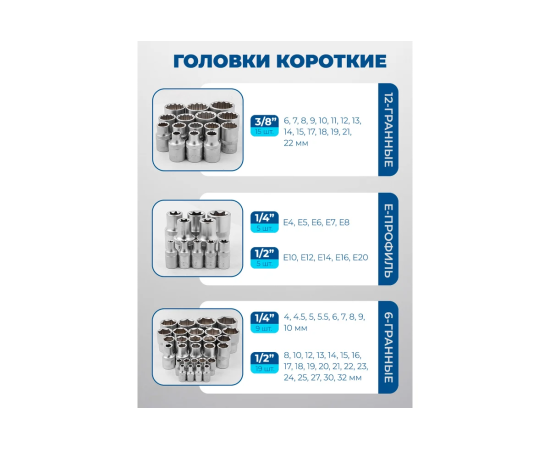 - Головки 3/8" короткие двенадцатигранные 6, 7, 8, 9, 10, 11, 12, 13, 14, 15, 17, 18, 19, 21, 22 мм. - 15 шт.;