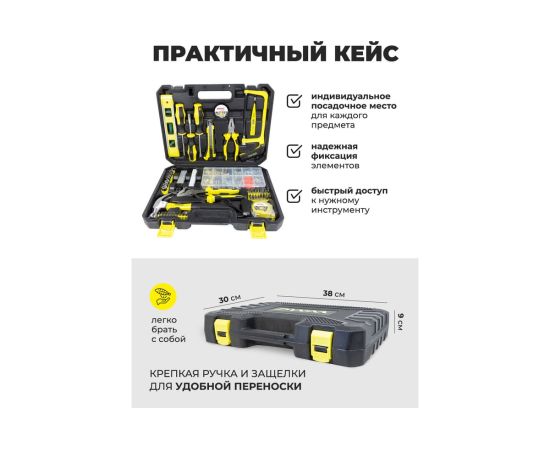 Удобство хранения и транспортировки: Все инструменты аккуратно упакованы в прочный пластиковый кейс, который защищает их от повреждений и легко переносится.
