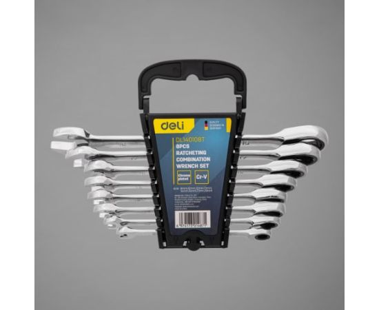 Набор комбинированных ключей с трещоткой DELI DL140108T включает в себя 8 ключей самых востребованных размеров.