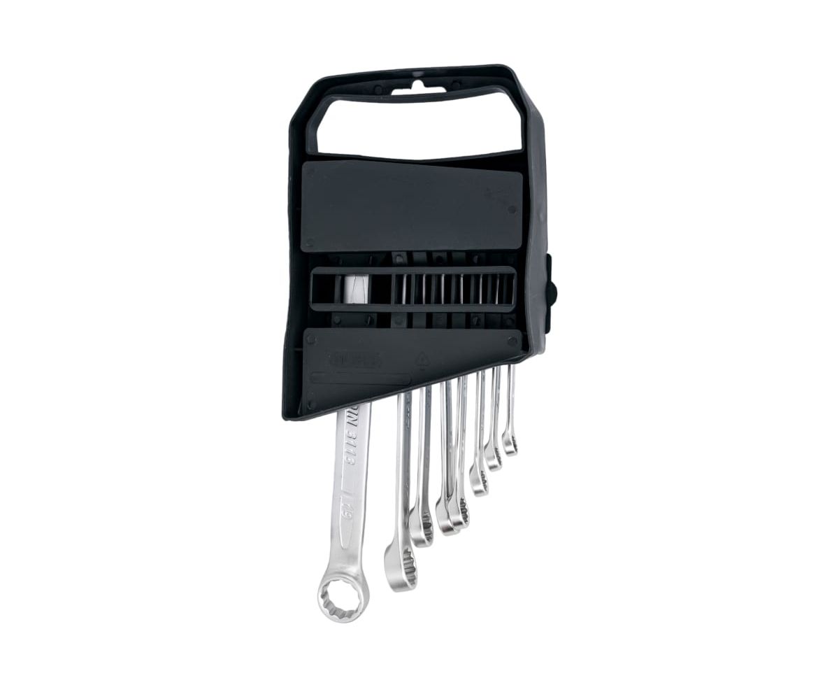 Набор комбинированных ключей представлен в оптимальной комплектации и включает в себя самые популярные размеры. Каждый элемент набора сочетает в себе два вида ключа - рожковый и накидной.