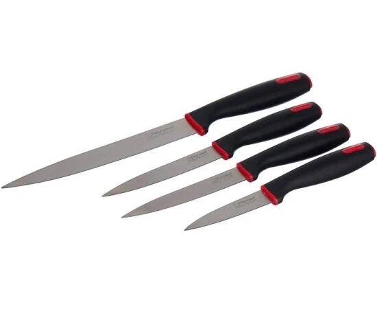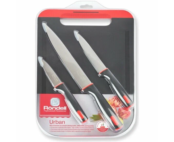 Бренд Rondell Цвет товара черный / красный Тип товара набор ножей Количество ножей 3 шт. Вид ножа Кухонный нож Назначение разделочные Состав набора ножей нож для овощей, разделочный нож, универсальный нож Аксессуары в наборе доска разделочная Материал лезвия сталь Материал рукоятки термопластичная резина Длина лезвия 20.3 см Минимальная длина лезвия 9 см Максимальная длина лезвия 20.3 см Твердость лезвия 52-55 HRC Комплектация Нож разделочный 20,3 см -1 шт Нож универсальный 12,7 см-1 шт Нож для овощей 9 см -1 шт Доска разделочная -1 шт Дополнительная информация Предметов - 4 шт. Страна производства Китай