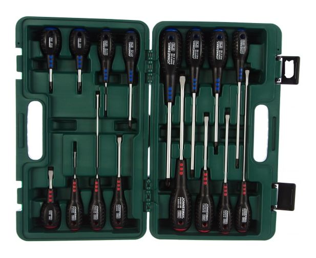 Набор отверток состоит из 16 инструментов - восемь отверток, имеющих прямой профиль и восемь отверток, снабженных крестовой головкой. Инструменты разного профиля отличаются друг от друга цветными вставками на корпусе рукоятки. Каждая отвертка подписана и имеет отверстие для подвески.