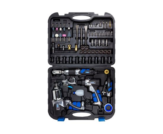 В составе набора пневмогайковерт "TWIN HAMMER" 1/2 650Нм, пневмозубило 4500 уд/мин, пневмотрещотка 1/2 68Нм, пневмошлифмашинка 25000 об/мин, пистолет для подкачки с манометром 0-8.5бар, продувочный пистолет, аналоговый манометр и аксессуары.