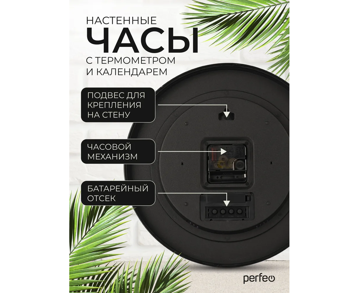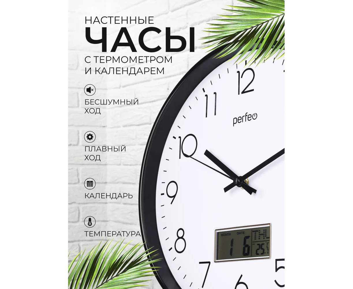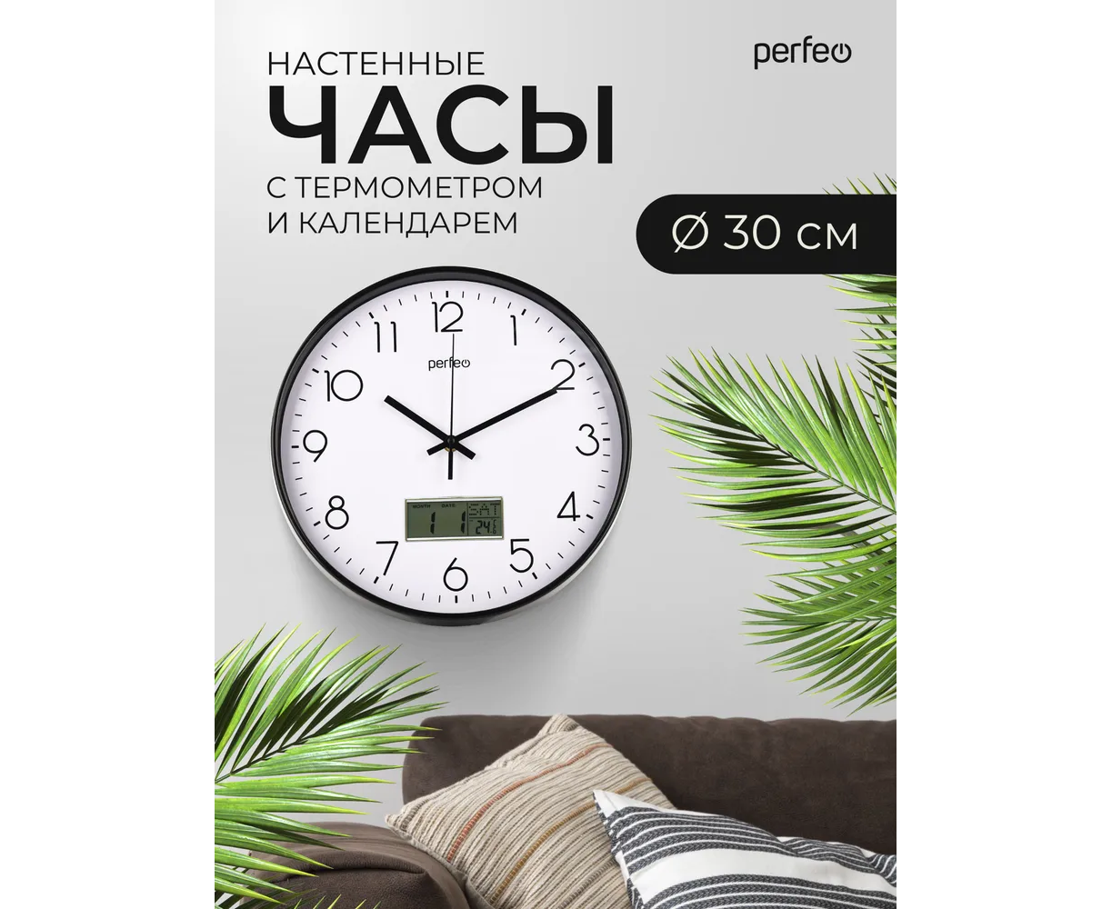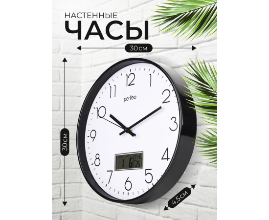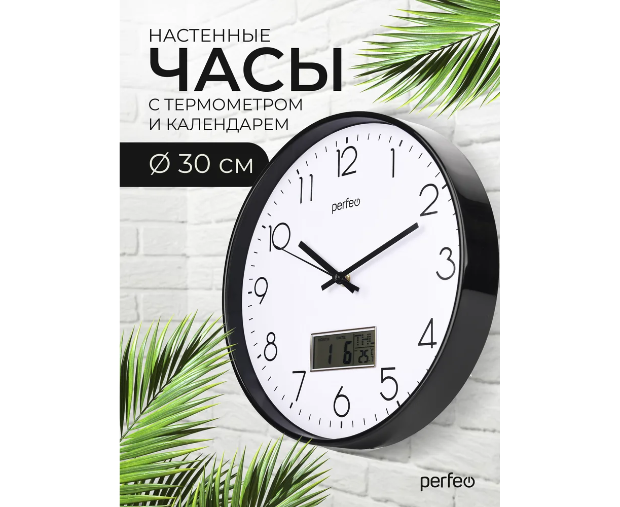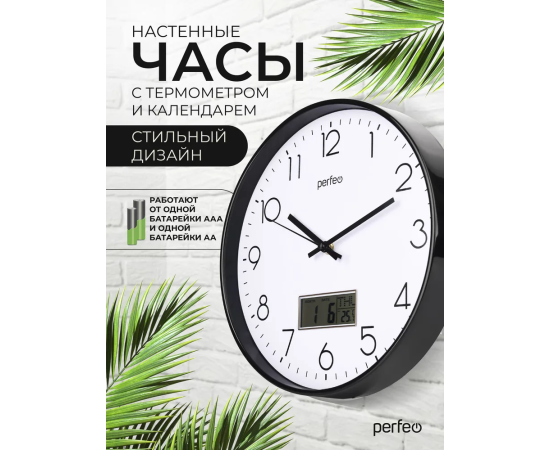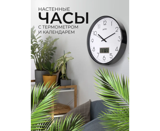 Настенные часы Perfeo "PF-WC-023"(С1), круг. 30 см, с темп и кален. черный корпус / белый циферблат