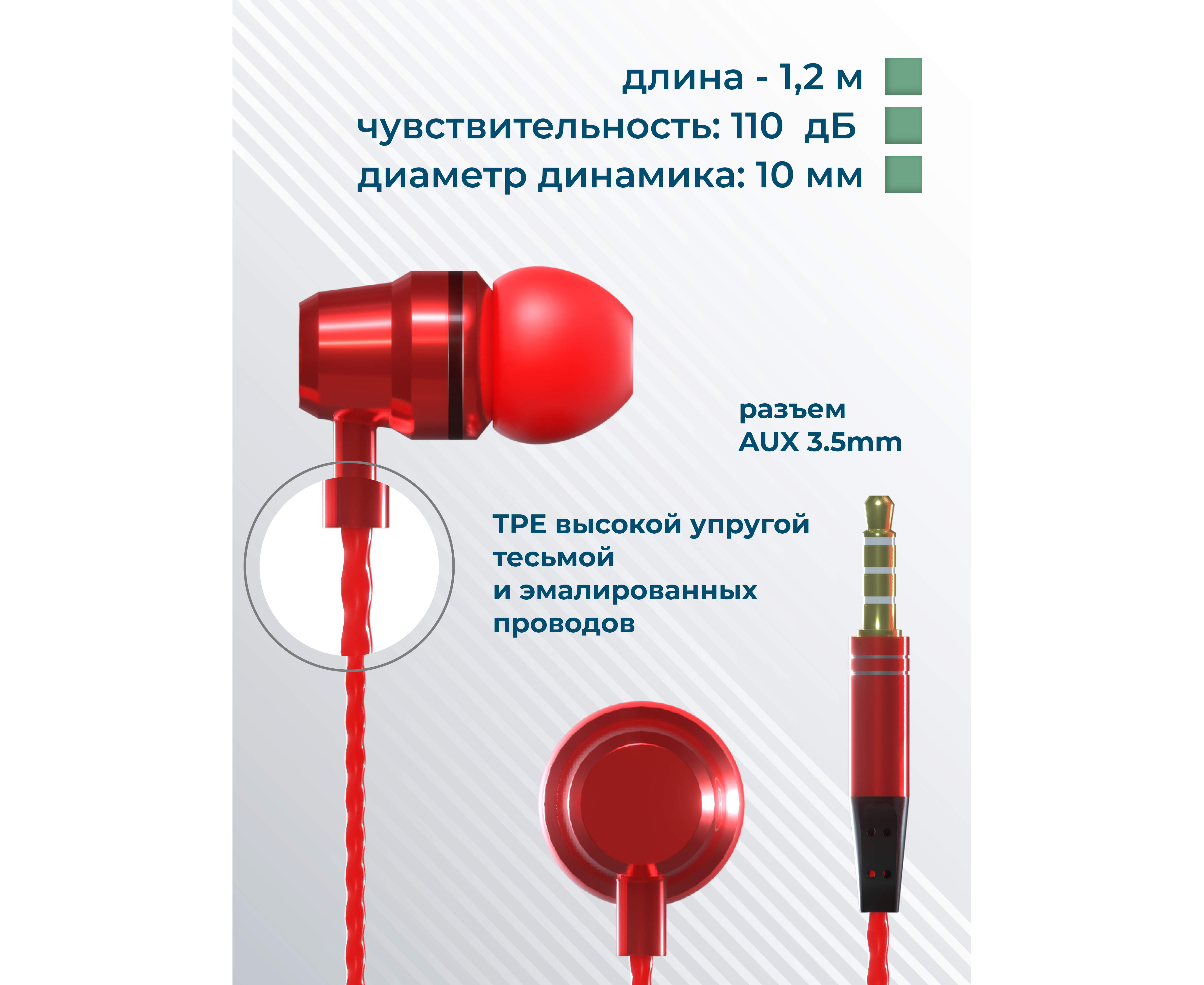 Материал: ABS-пластик, TPE, алюминиевый сплав Тип наушников: вакуумные, проводные Динамик: 10 мм Разъём: miniJack 3,5 мм Длина кабеля: 1,2 м Пульт ДУ: микрофон, регулировка громкости, старт/пауза, ответ на звонок Комплектация: наушники, сменные амбушюры, две пылезащитные заглушки для разъема AUX, кольцо-держатель для смартфона, буклет. Цвета: Black, Gold, Silver, Pink, Red