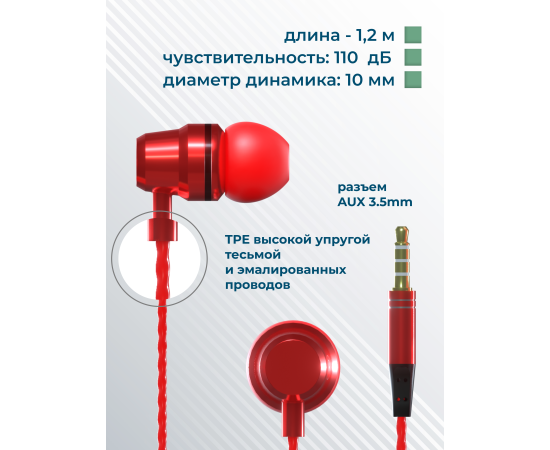 Наушники вакуумные AUX разъём с МК и рег.громкости длина 1.2м More Choice P71 (Red)