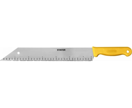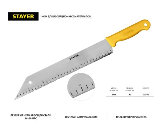 Нож для листовых изоляционных материалов, 340 мм STAYER 09592 предназначен для аккуратного и быстрого раскроя минеральной ваты, стекловолокна, пенополистирола.