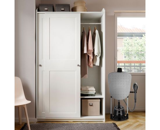 Телескопические стойки складные, а корпус отпаривателя компактный. Такая конструкция позволяет удобно хранить его в комнате или в шкафу.