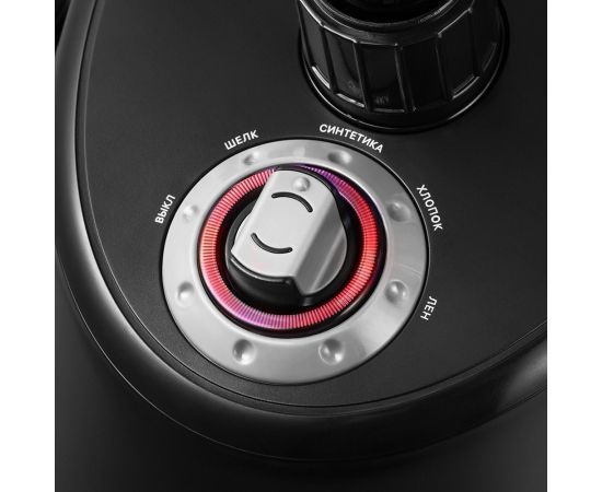 На панели управления располагается регулятор уровня подачи пара и индикатор работы: Шёлк, Синтетика, Хлопок, Лён), где Шёлк – минимальная подача пара, положение Лён – максимальная. Чем плотнее ткань, тем больше пара потребуется для разглаживания.