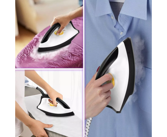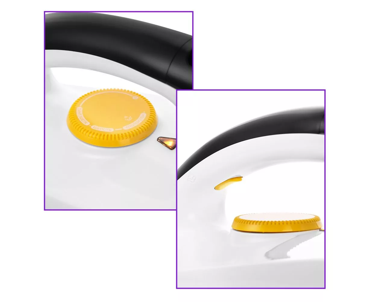 Регулятором настраивается температура нагрева подошвы утюга от 70 до 210 °C в зависимости от обрабатываемой ткани: Синтетика/Шёлк, Шерсть или Хлопок/Лён. Кнопка подачи пара удобно располагается на ручке парового утюга.