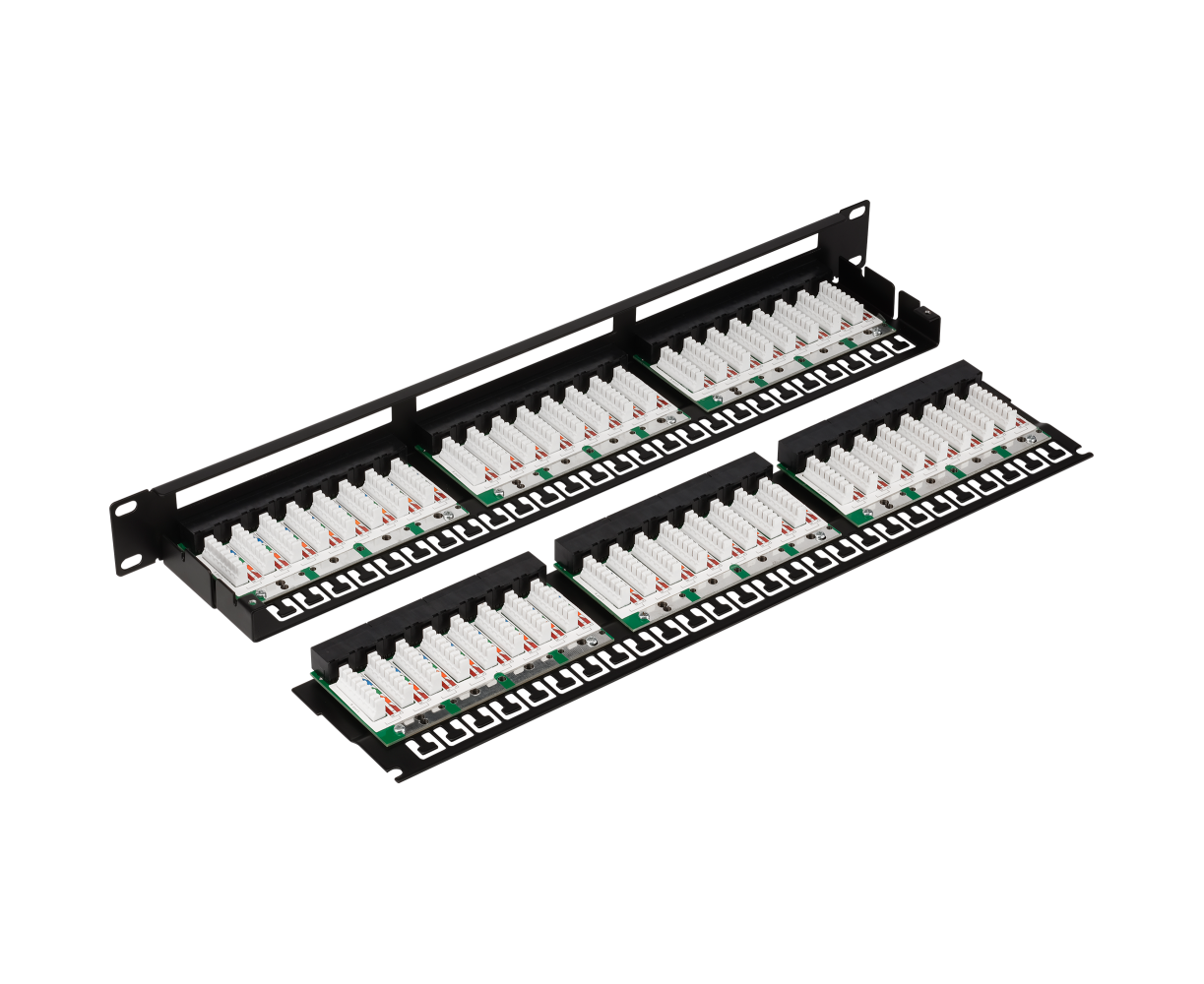 Патч-панель обеспечивает высокую плотность размещения портов RJ-45, а именно 48 портов на 1U. Площадка с верхним рядом портов съемная, чтобы было удобно работать с конструкцией в процессе монтажа.