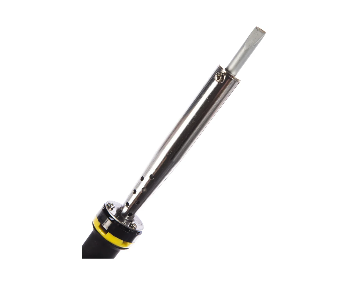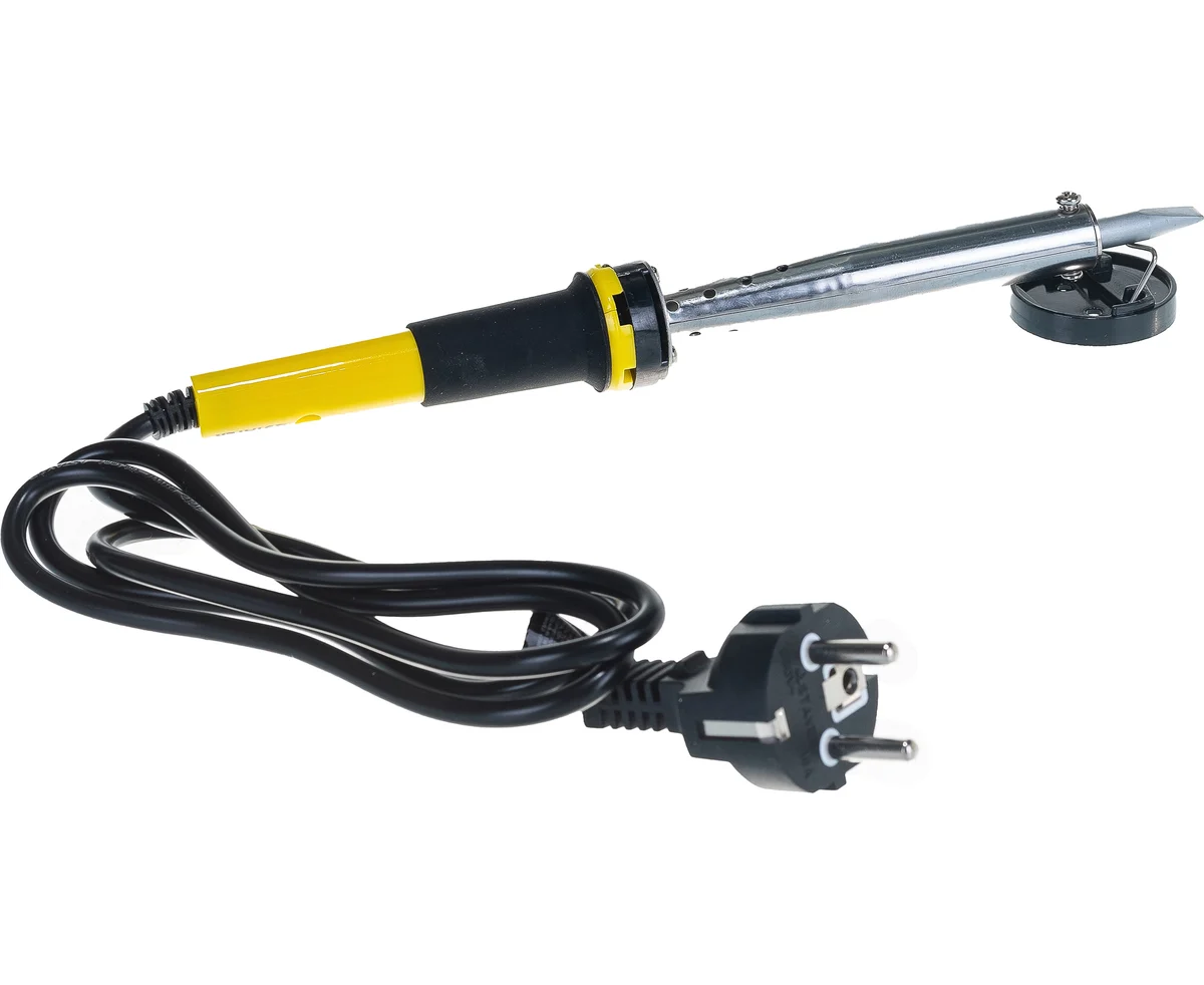Паяльник с двухкомпонентной рукояткой и долговечным жалом, в комплекте припой и подставка, 100Вт, клин STAYER PROFI 55300-100 - надежный и долговечный электрический прибор, выполненный из высококачественных современных материалов, который служит для напаивания электронных компонентов на печатную плату, пайки и лужения медных проводников, а также отпайки различных деталей.