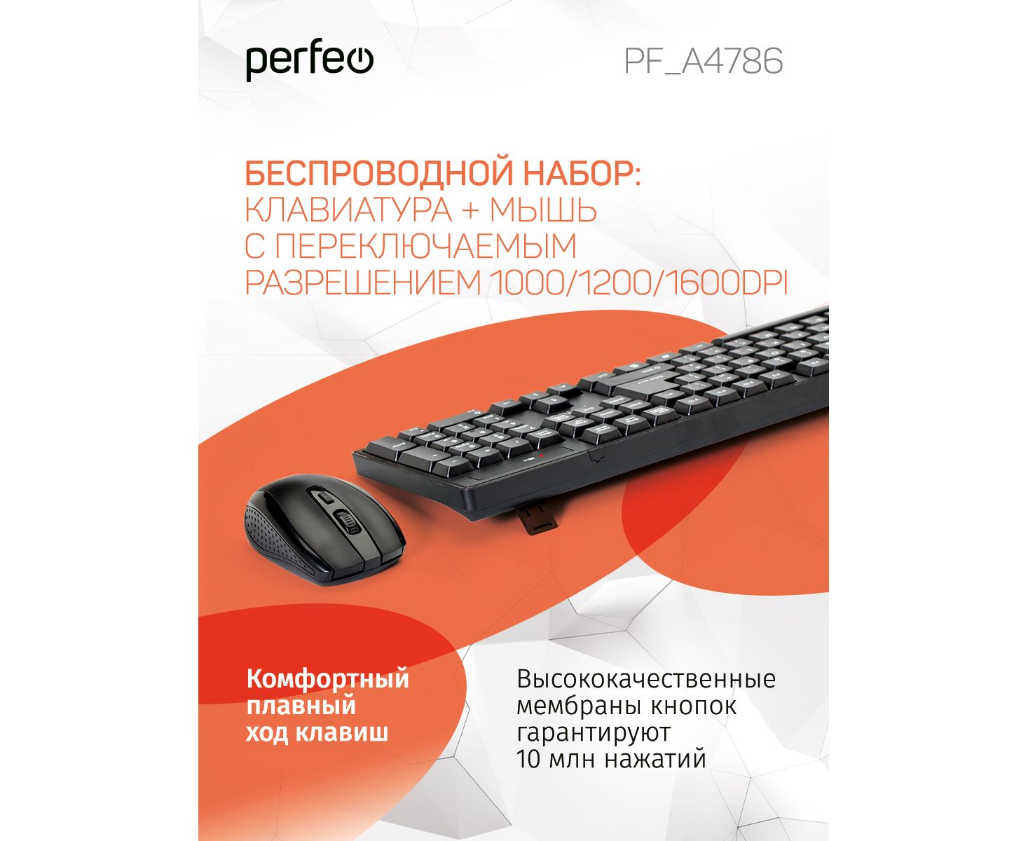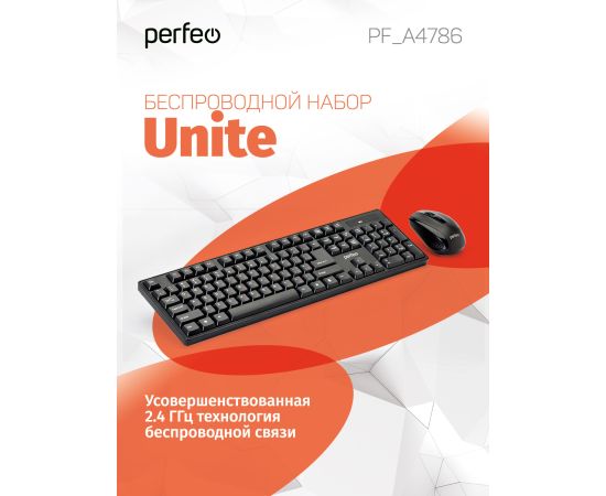 Беспроводной набор Perfeo клавиатура + мышь "UNITE", USB: кл.104 кн. + мышь 4 кн., 1000-1200-1600 DPI, чёрный