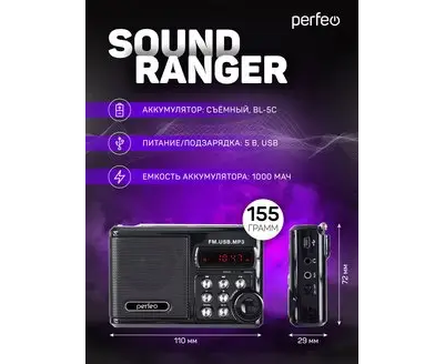 Мини-аудио Perfeo Sound Ranger, УКВ+FM, MP3 (USB/TF), USB-audio, BL-5C 1000mAh, черный (SV922BK)