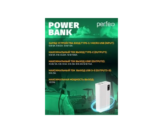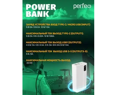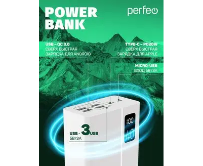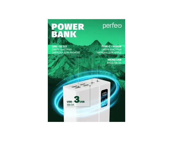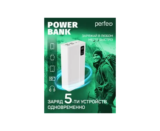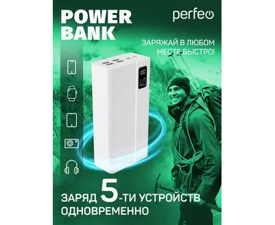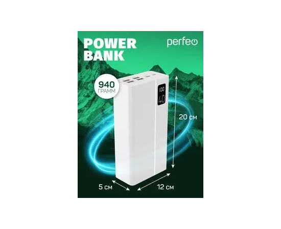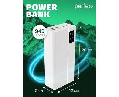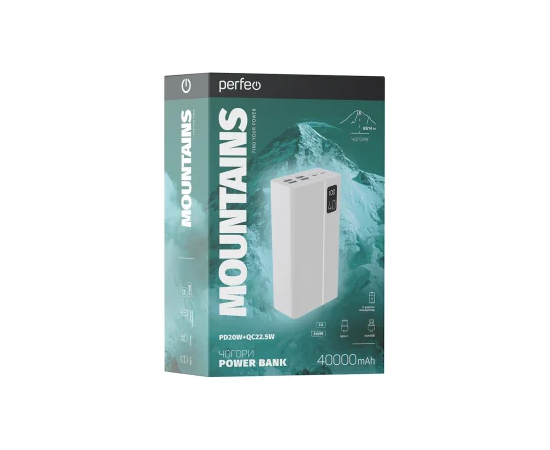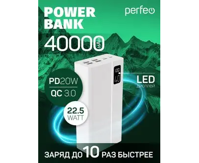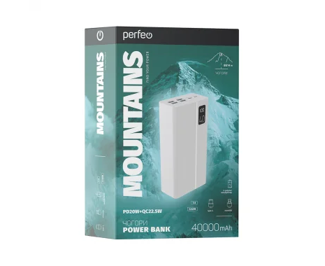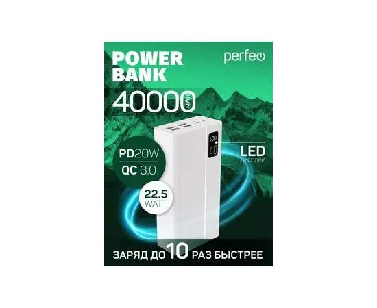 Повербанк Perfeo MOUNTAINS 40000 mAh/LED дисплей/PD + QC 3.0/Type-C/4 USB/Выход: 3A, max 22.5W/Белый