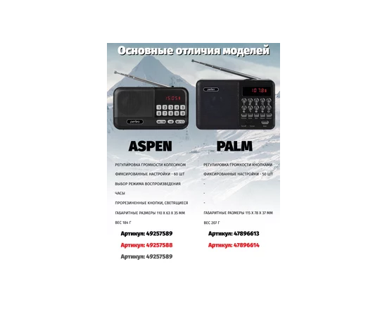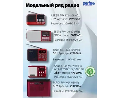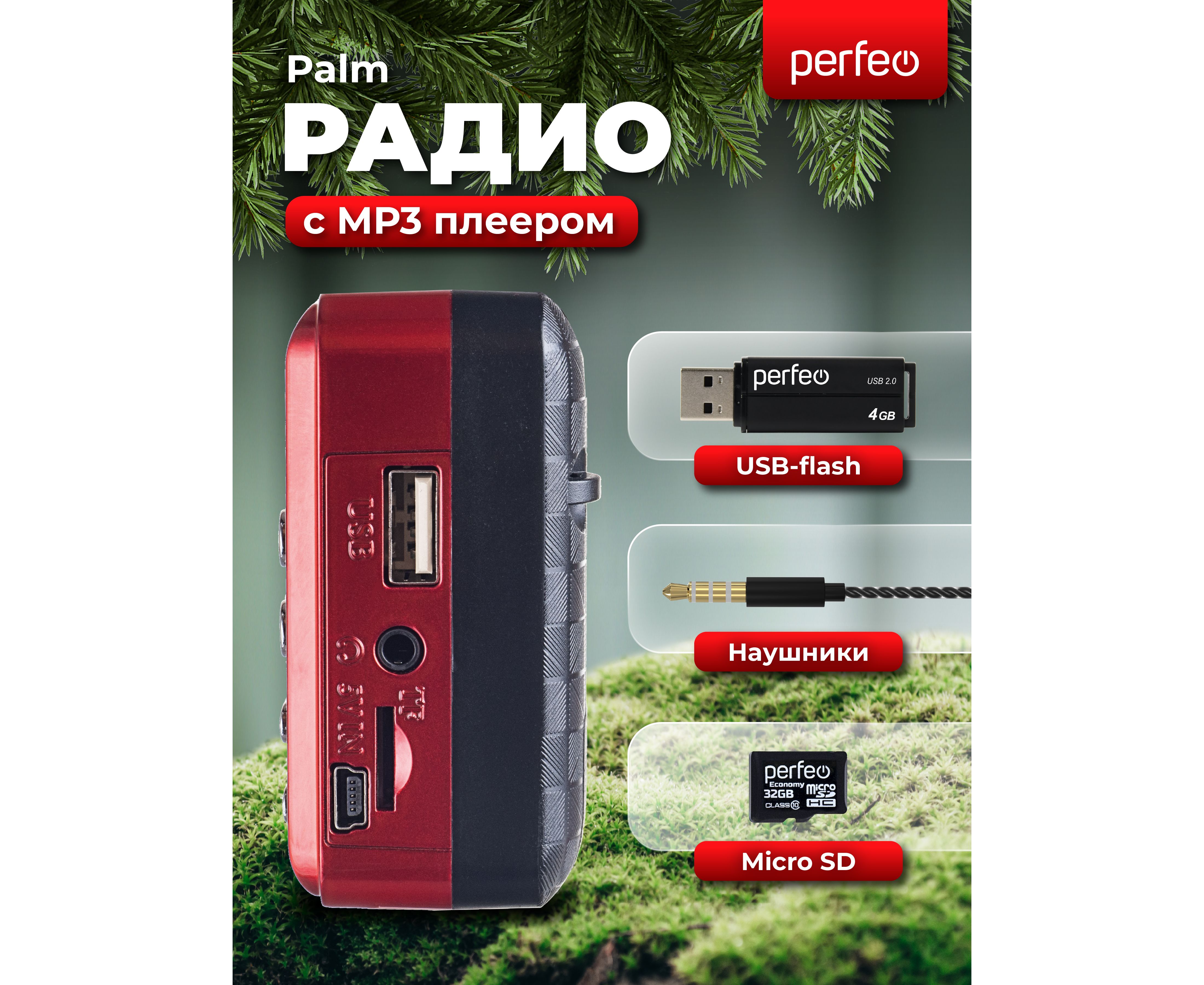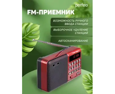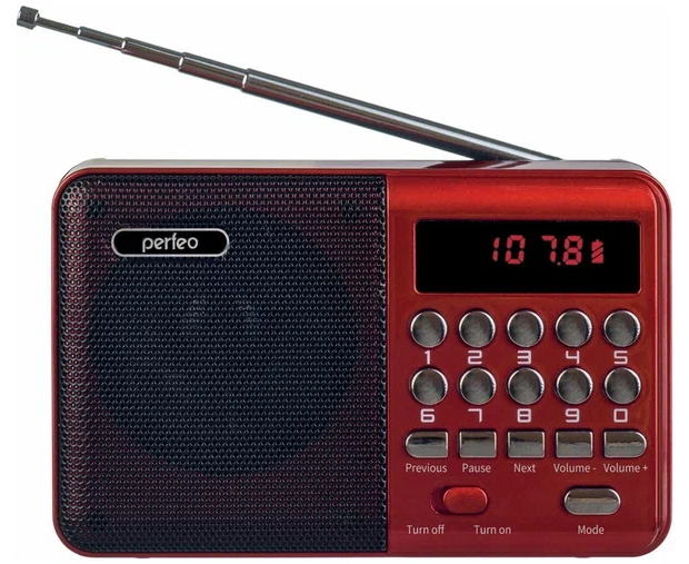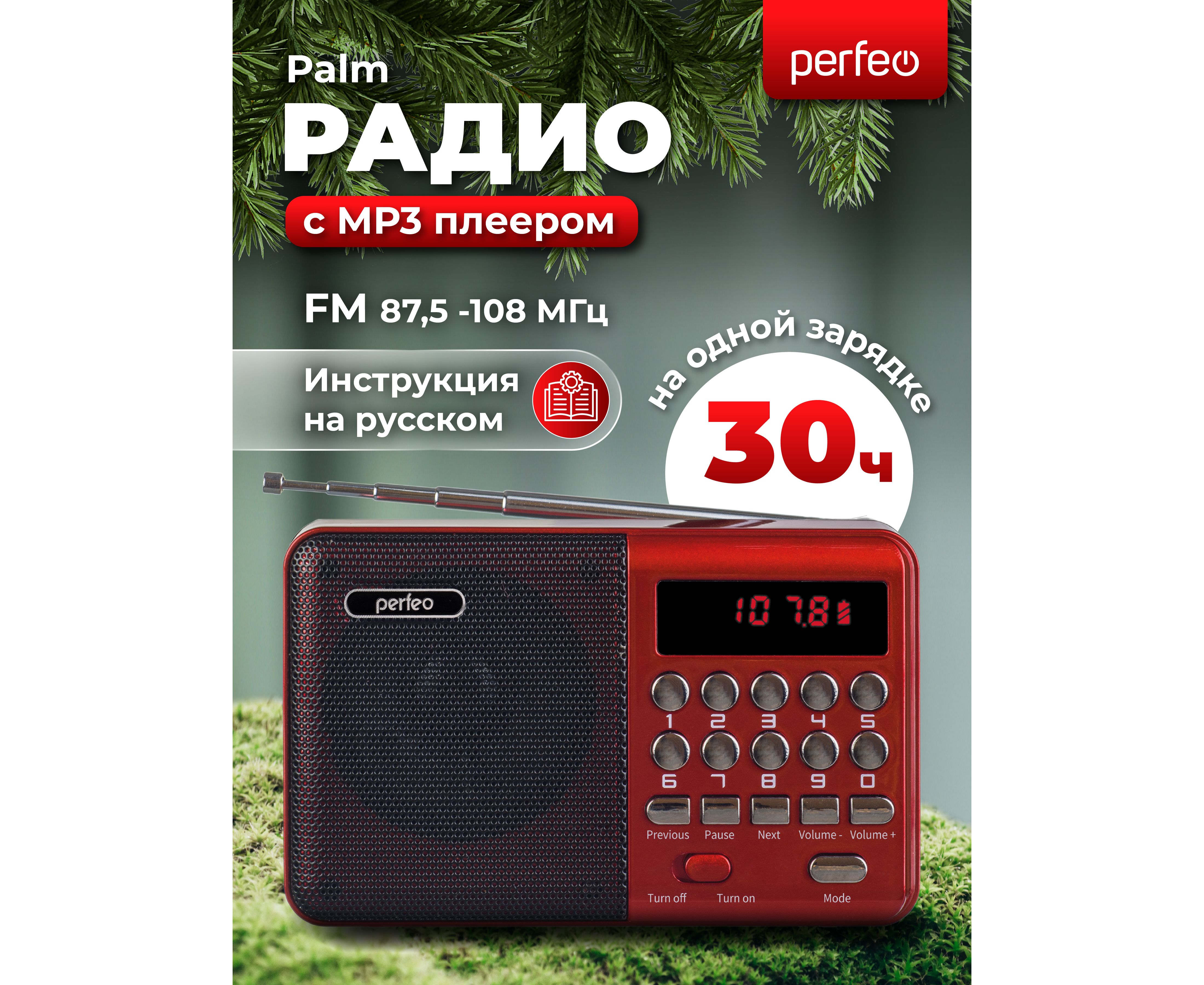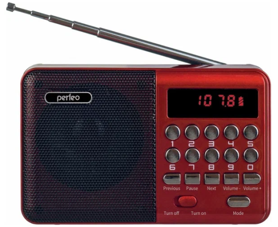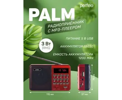 Радиоприемник цифровой Perfeo PALM (i90). Радио с расширенным функционалом умеет воспроизводит MP3-файлы с карт памяти и USB-флэшек. Приемник может работать не только от аккумуляторов (18650), но и от адаптера для зарядки (в комплект не входит) подключенного в сеть 220В. Радиоприемник от сети имеет встроенное цифровой тюнер FM (87,5 – 108 МГц) с автоматическим поиском станций. Радио оснащено поворотной телескопической антенной, возможность воспроизведения музыки с USB flash и microSD карт памяти, вход AUX для подключения источника звука. LED-дисплеем (отображает номера mp3-треков и частоту радиостанции). В комплекте идет кабель miniUSB для зарядки радиоприемника. Радиоприемник мини компактного размера удобно переносить, он помещается в карман. Это радио на аккумуляторе можно слушать даже ночью и не беспокоится, что можно кого-то разбудить, ведь у колонки с радио есть разъем для наушников. Радио PALM – отличный попутчик для поездок, путешествий и прогулок. Радиоприемник от сети и аккумулятора - легкий, удобный, компактный и многофункциональный, не займет много места и не оставит вас без любимой музыки. В нашем ассортименте магазина Perfeo есть множество портативных радиоприемников, они станут отличным подарком для родителей, дедушек и бабушек, подарят хорошее настроение и станут украшением вашего интерьера, прекрасно впишутся в любой дизайн, как дома, так и на даче, незаменимы в походе. Радиоприемник легко зарядить от повербанка, он не прихотлив в использовании.