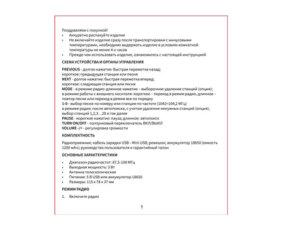 Комплектация1 шт руководство пользователя; Радиоприемник 1 шт; USB кабель Mini USB - 1 шт