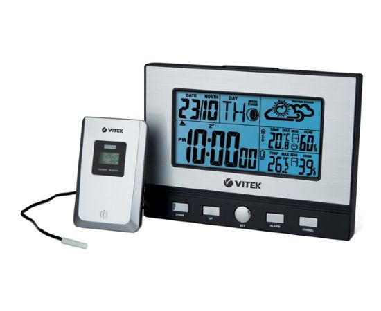 Метеостанция VITEK VT-3533 измеряет температуру внутри помещения и за пределами дома. Определение уровня влажности способствует тщательному контролю показателя: при необходимости это позволяет предпринимать меры для его нормализации. В комплектации предусмотрены основной блок и выносной датчик, который необходимо размещать на улице. Цифровой монохромный дисплей с голубой подсветкой отображает данные, включая фазу луны и прогноз погоды в виде символов.