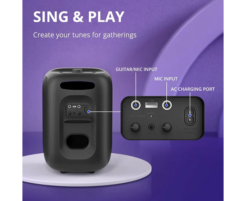 влагозащищенный корпус, караоке, поддержка microSD, режим Power Bank, световые эффекты