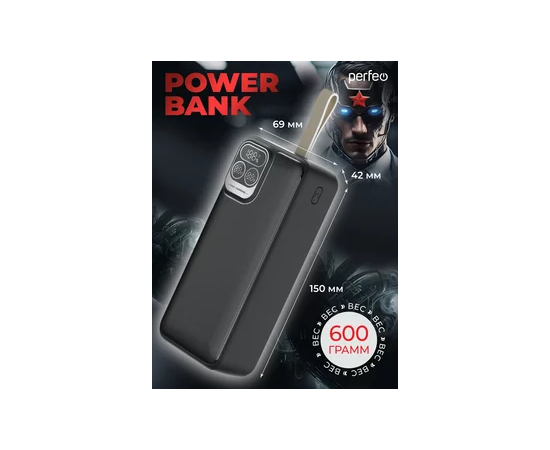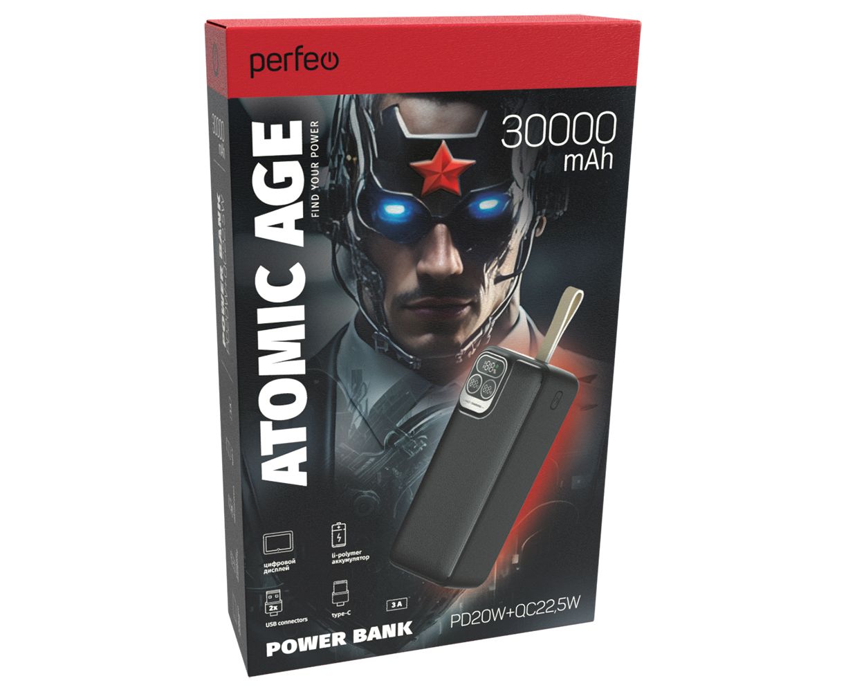 Повербанк Perfeo Atomic Age 30000 mAh/LED дисплей/PD + QC 3.0/Type-C/2 USB/Выход: 5A, max 22.5W/ Черный