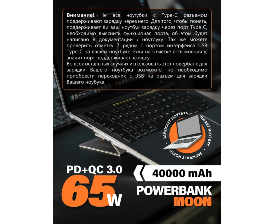 Внимание! Не все ноутбуки поддреживают зарядку через Type-C. Более подробно описали на слайде, см фото. Внешний аккумулятор Moon 40000 mAh – это незаменимый гаджет для тех кто часто находится в пути и нуждается в дополнительной зарядке своих устройств. Ёмкость в 40000 мА*ч, повербанк обеспечивает достаточно мощности для нескольких циклов зарядки телефона, планшета, может зарядить ноутбук. Одним из главных преимуществ этого аксессуара является наличие нескольких видов разъемов (USB-A, Type-C), что позволяет подключать различные устройства одновременно и заряжать их быстро и эффективно. Материал корпуса выполнен из высококачественного поликарбоната, что делает его одновременно легким и прочным. Встроенная защита от перегрева, перезаряда и короткого замыкания гарантирует безопасность использования. Дополнительная опция портативного зарядного устройства включает возможность зарядки малым током, которая подходит для беспроводных наушников, смарт часов и фитнес браслетов. Функция сквозной зарядки позволяет одновременно заряжать до трех устройств, а возможность быстрой подзарядки делает его идеальным выбором для тех, кто ценит свое время и всегда хочет быть на связи. Повербанк поддерживает протоколы быстрой зарядки QC 3.0 и PD. Максимальный выходной ток 3.25А обеспечивает очень быструю зарядку ваших устройств. Благодаря своей универсальности и наличию различных гнезд, переносной аккумулятор может быть использован для зарядки любой электроники, включая модели iPhone и Android. Универсальный и стильный внешний аккумулятор Moon станет незаменимым помощником для всех, кто ценит удобство, функциональность и возможность всегда оставаться на связи. . Характеристики по выходным напряжениям и токам указана на отдельном слайде.