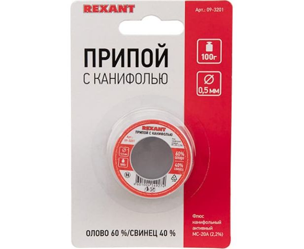 Припой с канифолью REXANT 09-3201 100г, 0.5мм, (олово 60проц., свинец 40проц.), катушка, блистер