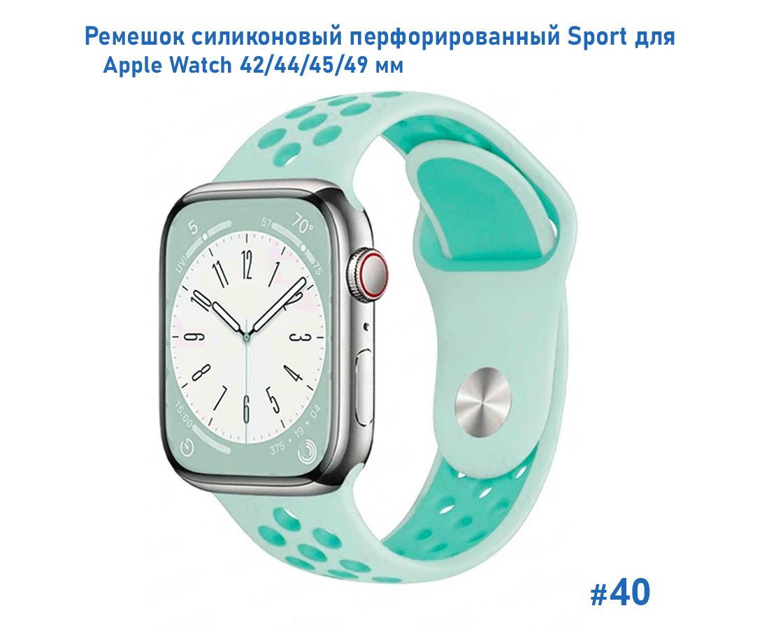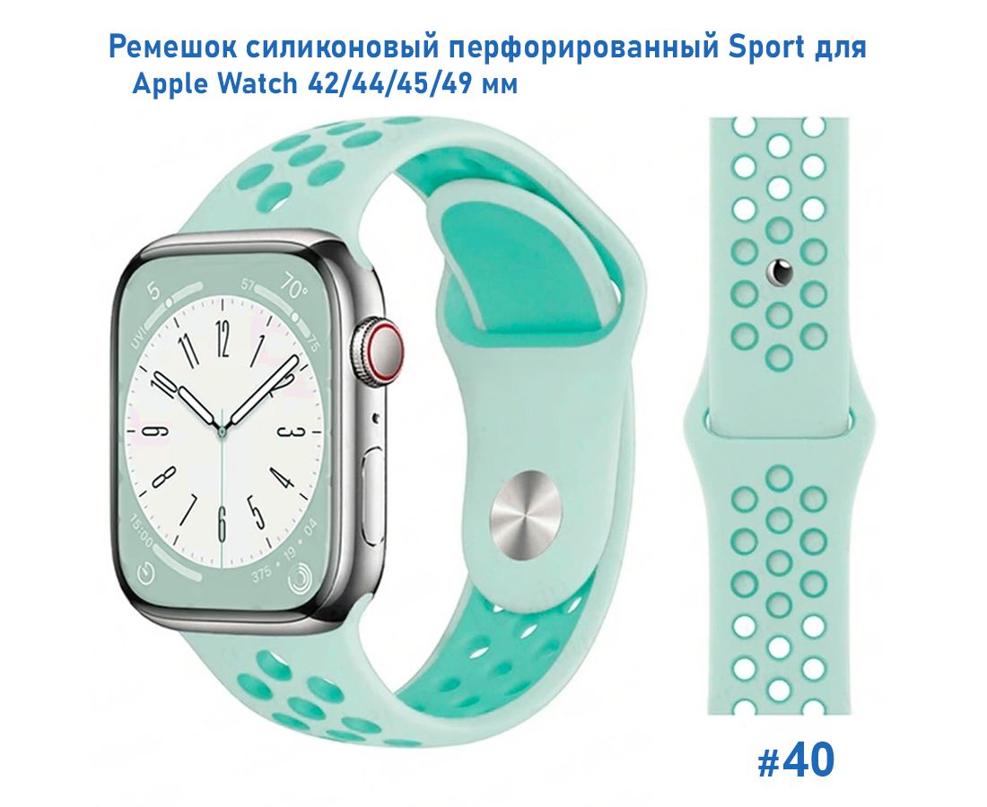 Ремешок силиконовый перфорированный Great Case Sport NK для Apple Watch 42/44/45/49 мм, 235мм, на кнопке, бледно-бирюзовый+мятный (40)