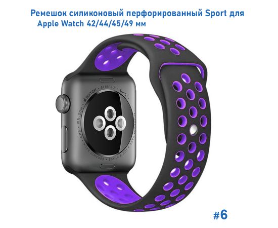 Ремешок силиконовый перфорированный Great Case Sport NK для Apple Watch 42/44/45/49 мм, 235мм, на кнопке, черный+фиолетовый (6)